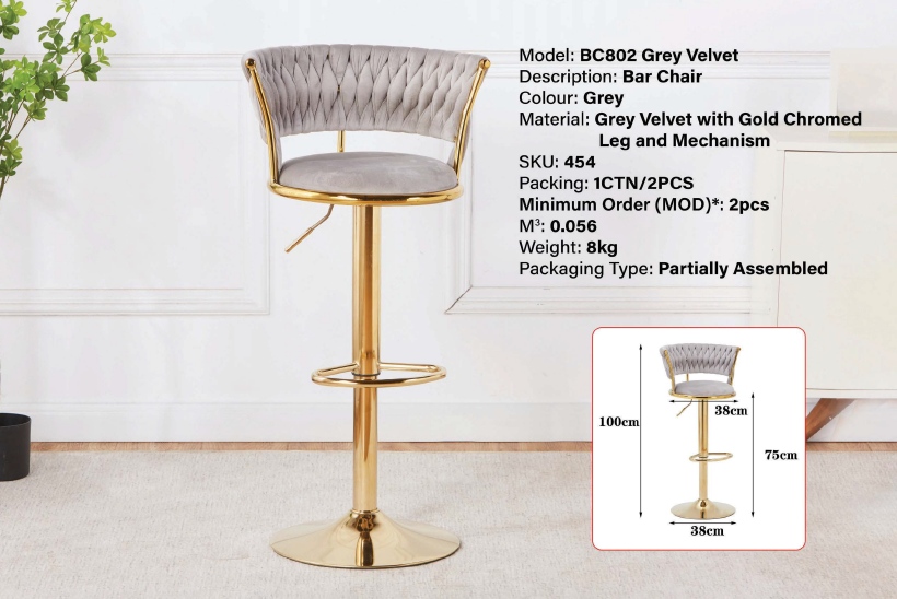 BC802 BAR CHAIR (GREY VELVET) (SL)