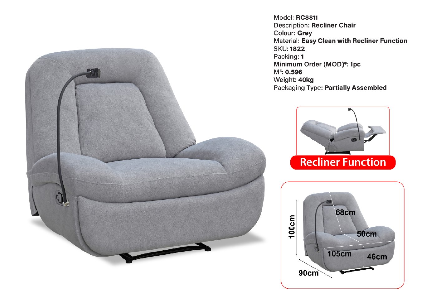 RC8811 RECLINER CHAIR (GREY EASY CLEAN FABRIC) (LEF)