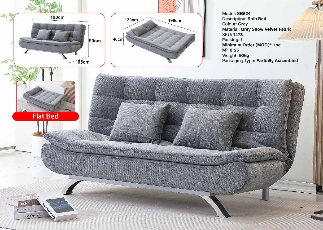 SB624 SOFA BED (GREY SNOW VELVET FABRIC) (LEF)