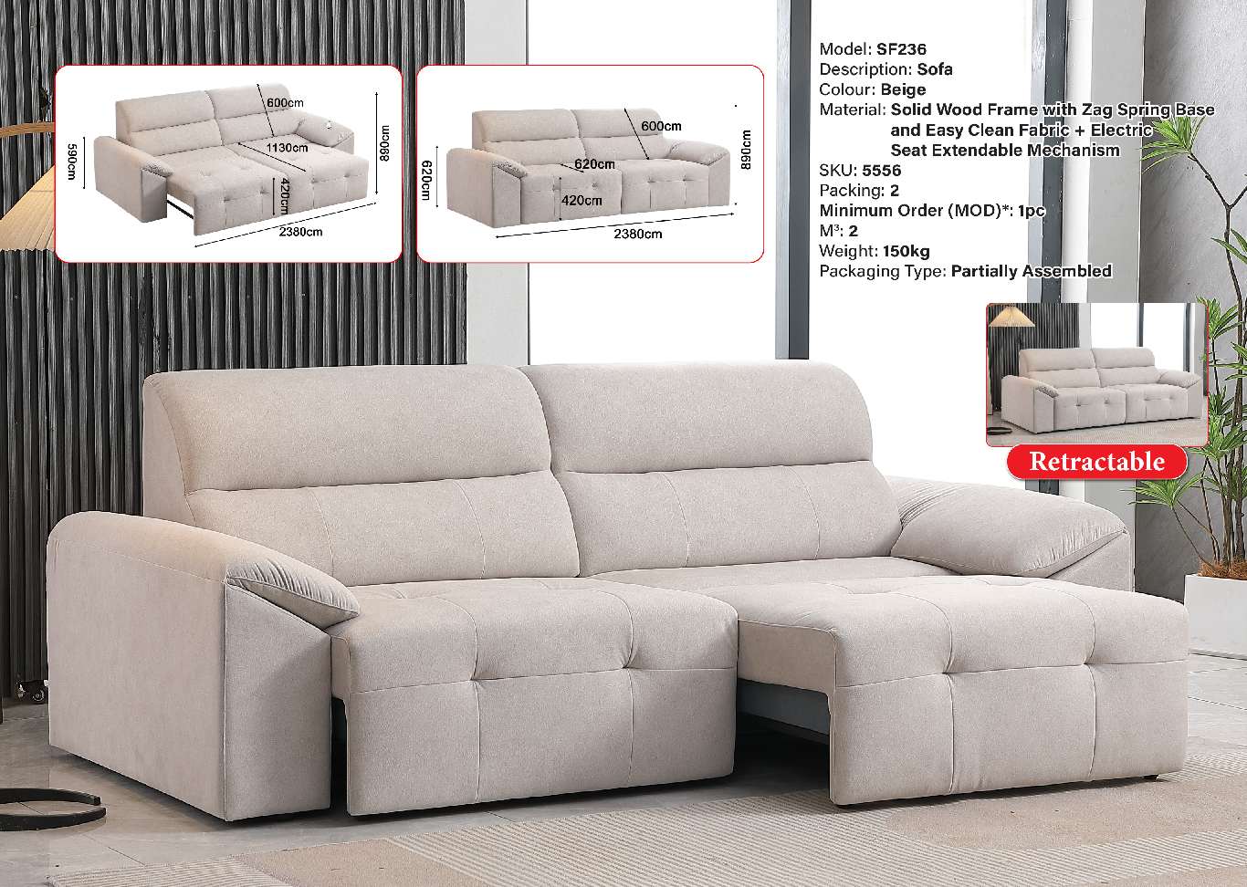 SF236 ELECTRIC SEAT EXTENDABLE SOFA (BEIGE EASY CLEAN FABRIC) (LEF)